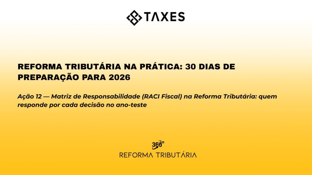 A Ação 12 trata da criação de uma matriz de responsabilidade (RACI fiscal) específica para o ano-teste da Reforma Tributária.